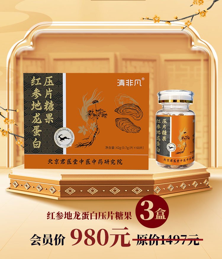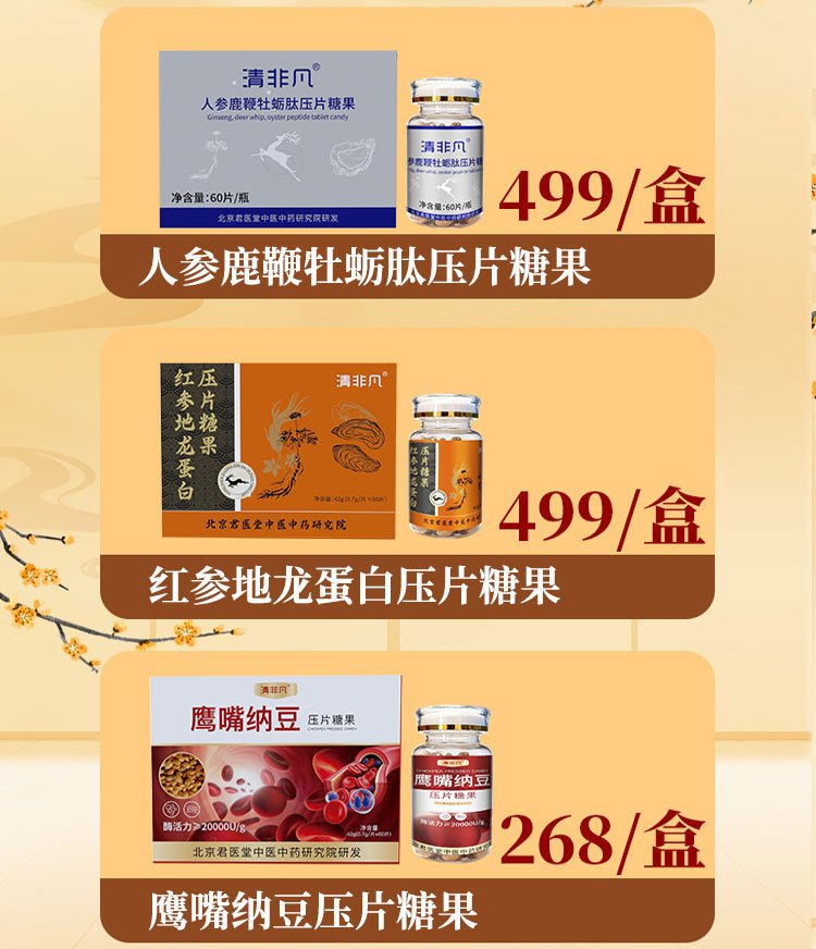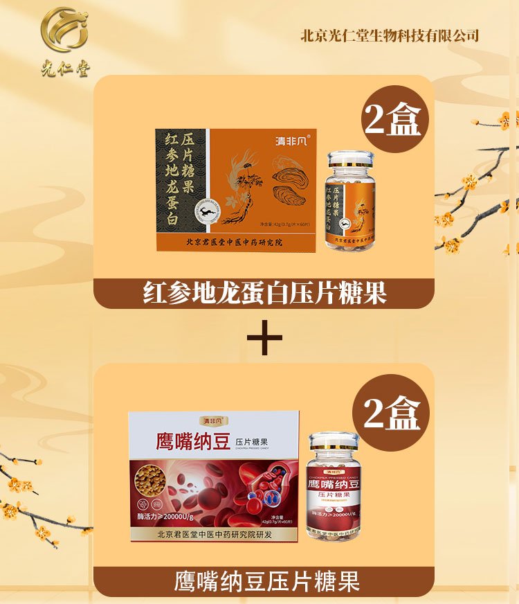 • 【人参鹿鞭牡蛎肽压片糖果1盒+红参地龙蛋白压片糖果1盒+鹰嘴纳豆压片糖果 】组合套餐二